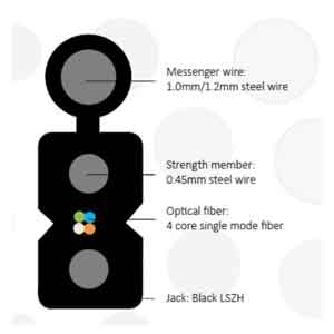 The optical fibre unit is positioned in the centre. Two parallel fiber reinforced plastic or steel wire are placed at the two sides. Then the cable is completed with a black LSZH sheath.